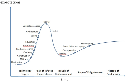 Some 3D printing technologies were invented in the early 80s, but they remained a niche technology used only for rapid production of prototypes for form and fit testing, hence the synonym "Rapid Prototyping". After the expiration of a key patent in 2009, the "Maker Movement" emerged with many start-ups offering cheap hobbyist 3D printers. A media frenzy in 2012 thrust 3D printing into the limelight and major players reported dramatic growth in sales of consumer-level printers, up to a $1.2B market for printer sales in 2014.