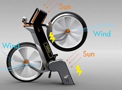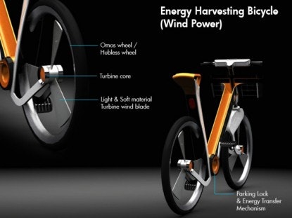 The bicycle is able to generate electricity in two ways. Firstly the wheels of the bicycle are hubless and hold incorporated wind turbines. The turbines enable the bicycle to harvest energy from the wind even when the bicycle and wheels are stationery in order to generate electricity. When the bicycle is moving, the moving wind activates the turbine.
