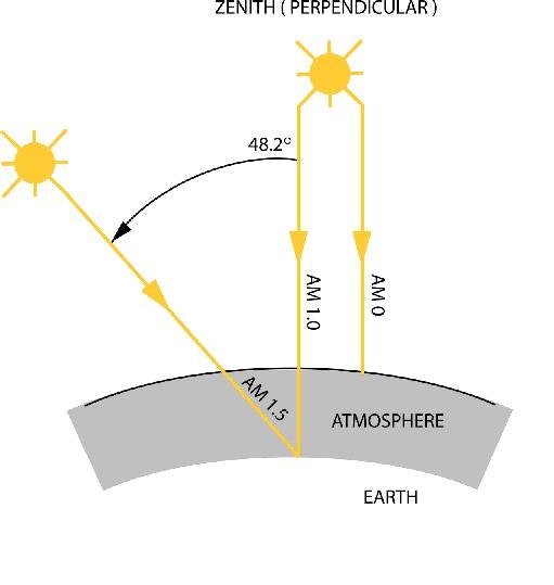 Photovoltaic cells of different chemistries and morphologies have very different tolerance of light at a variety of angles. Various geometrical factors, such as the tilt of the earth rotational axis, its orbital motion around the sun or the sunlight incident angle, affect the light intensity on the earth surface. Moreover, the atmosphere alters the sun radiation by absorbing and reflecting selected wavelengths. For terrestrial measurements (at the Earth's surface) the number following the AM designation is the inverse of the cosine of the zenith angle subtended by the sun and the surface normal (Equation 7). The solar spectrum that strikes the earth surface at the equator at noon at the equinox is called AM1.0 (air mass 1.0), but most of the time and for most locations on the globe, sunlight actually passes through more than one air mass before reaching the earth surface. Therefore solar cells are generally characterized with a normalized spectrum, called AM 1.5 radiation, of 1000 W/m2 or 1 sun irradiance at 25 oC (IEC 904-3). The light passes the atmosphere at an angle of 48.2 degrees its path is 1.5 times the minimum distance (sun at zenith). The figure compares the actual solar spectra for AM0 and AM1.5. The difference between these two spectra is due to the spectral absorption from components of the Earth's atmosphere, such as H2O and O2.